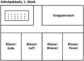 [x] Klassenräume: Da die Klassen nach Elementen aufgeteilt werden, gibt es in jedem Jahrgang vier Klassen und somit auch vier Klassenräume. Die Klassenräume bieten viel Platz für theoretisches und praktisches Lernen. Jeder Schüler hat einen Sitzplatz und einen Tisch für sich allein.